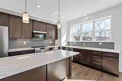 The kitchen is appointed with quartz countertops, contemporary cabinetry, stainless steel appliances, and flows seamlessly into open-concept living and dining areas ideal for both everyday living and entertaining. Large windows throughout the home provide abundant natural light, while modern lighting and finishes create a clean, elevated aesthetic.