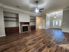 Inside, the living room is warm and inviting with LVP flooring, a cozy fireplace, ceiling fan, and built-in cabinets and shelving that add both character and convenient storage. The kitchen is designed for everyday living and entertaining, featuring tile flooring, stainless steel appliances including a stove, refrigerator, dishwasher, and microwave, along with ample cabinet and counter space. Can lighting and a window above the sink bring in great natural light, while the open layout flows seamlessly into the dining area.