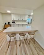 The well-appointed kitchen includes modern shaker cabinets and new quartz countertops. The new stainless steel fridge, oven/stove, and microwave elevate the design of the heart of the home and make it move-in ready!