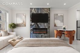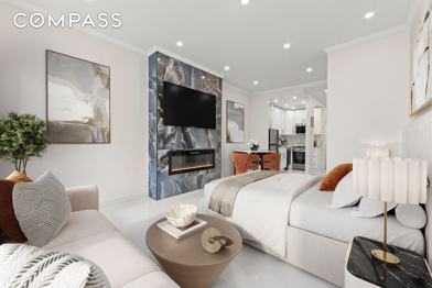 No Board Approval Required Fully gut-renovated apartment in prime Yorkville, offering modern finishes and thoughtful design throughout. This bright, south-facing home is filled with natural light and features porcelain tile flooring, crown molding, and recessed lighting with dimmers in every room. The stylish kitchen boasts stainless steel appliances, a dishwasher, and a sleek marble backsplash. The bathroom is beautifully updated with mosaic tile work, creating a clean, contemporary feel. Enjoy added comfort with an electric fireplace that provides heat, as well as a through-the-wall AC unit. The apartment also offers ample closet space, including additional storage above. Located just two flights up in a well-maintained cooperative walk-up, with no board approval required making for a seamless move-in process. Be the first to live in this newly renovated home. Please note the photos have been virtually staged for illustrative purposes.