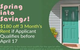 SPECIAL OFFER: Get $180 off 3 Month's Rent if you apply and qualify by April 17, 2026. All applicants in the home must qualify for the special offer. $180 off the 2nd, 3rd, and 4th months based on a 13-month lease.