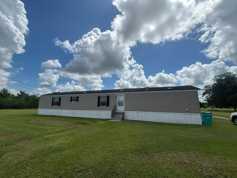 This spacious manufactured home offers comfortable country living on a generous lot with beautiful open green space and mature trees. The well-maintained exterior features neutral gray siding with black shutters and a dark roof, giving it great curb appeal.