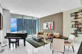 Rent at Miami’s most iconic tower, Aston Martin Residences, this designer-decorated and fully furnished oversized one-bedroom offers panoramic bay views through floor-to-ceiling windows. The open kitchen features premium Gaggenau appliances and refined high-end finishes throughout.
