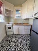Small studio with tons of lighting! Pergo flooring, ceiling fan, darling tile on kitchen floors, private deck just for you!