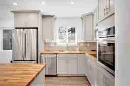-Beautifully updated kitchen with gray cabinetry and butcher block counters