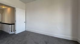 This Philadelphia residence offers a blend of comfort and functionality across two floors. The ground level includes one of two living rooms, showcasing a modern ceiling fan and vertical blinds that allow for adjustable natural light. A white wooden staircase with dark treads leads to the upper level.