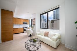 The modern kitchen is outfitted with high-end appliances, custom cabinetry, and stylish finishes that elevate the space. The living area offers a calm, sophisticated ambiance, while the bedroom provides a peaceful retreat with ample closet space. A contemporary bathroom with premium fixtures completes the home.