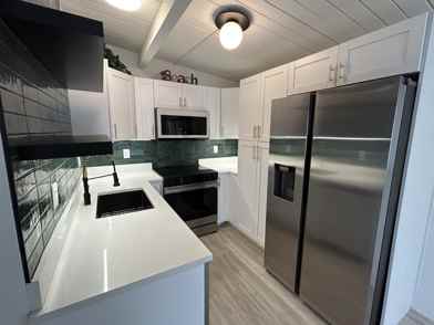 This beautifully maintained suite is truly move-in ready, featuring charming cottage-style wood ceilings, a gorgeous kitchen with white granite countertops, stainless steel appliances, and durable laminate flooring throughout. Enjoy your own private entrance through elegant French doors at the rear, adding both convenience and a touch of character.