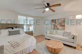 This second-floor Studio unit is accessed by a shared hall curved staircase. There is plenty of space for a queen bed and sofa. The stack washer and dryer are conveniently located in a closet. The lease does include water, but Duke Energy and Wi-Fi are the tenant's responsibility.