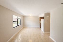 The open living space is bright and inviting, with tile flooring throughout for easy maintenance and a clean, cohesive look. The kitchen has been thoughtfully updated with new cabinets, modern hardware, and ample counter space, creating a practical and stylish cooking area.
