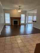 As you enter the front door, you will see the large living area directly in front of you. Adorned with a fireplace and a ceiling fan, this room lets in lots of natural light with the two windows to the left and right of the fireplace.