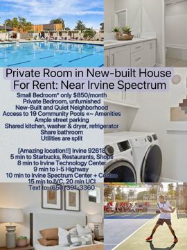 *Limited time* only 850/mo & Private Bedroom New-Built and Quiet Neighborhood Access to 19 Community Pools + Amenities Ample street parking &, unfurnished Shared kitchen, washer & dryer, refrigerator Share bathroom with 1 person Utilities are split [Amazing location!!] Only 5 min to Starbucks, Restaurants, Shops 8 min to Irvine Technology Center 9 min to 1-5 Highway 10 min to Irvine Spectrum Center + Costco 15 min to IVC, 20 min to UCI Text to: (650) 391-3360