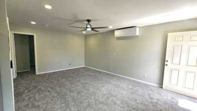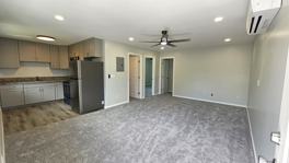 Living room includes split AC that will keep the entire unit cool. All rooms have ceiling fans, custom paint and carpet. The bathroom has a built in shower shelf and tile floors to keep it cool. The kitchen includes custom cabinets and granite counters.