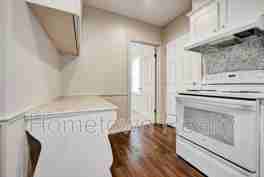 Inside, the kitchen is bright and welcoming, with clean white cabinets and a warm touch to the flooring. The bathroom is larger than expected, featuring two sinks and direct access to a roomy walk-in closet with built-in shelves.