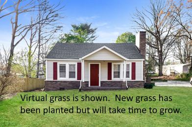 The grass seed was just planted and needs time to grow. The photos of the exterior show virtual grass.