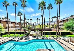 Resort-style living at the Biarritz in the heart of Palm Springs. The Biarritz is a unique landscape, set on nearly five acres and surrounded by desert mountain views. This well-maintained community offers a true getaway experience just moments from downtown dining, shopping, and entertainment, including Agua Caliente Casino Palm Springs. Community amenities include a pool, two spas, and two tennis courts with pickleball lining, along with assigned covered parking. Privately positioned on the first floor and toward the rear of the complex, this unit offers a quiet, secluded setting away from road noise. Two balconies capture sweeping views of the surroundings, including breathtaking vistas of the Chocolate Mountains. Interior upgrades include energy-efficient lighting and a bathroom fan with a built-in speaker for added functionality and daily comfort.