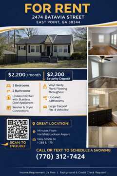 3 Spacious Bedrooms / 2 Full Bathrooms Updated Kitchen with Stainless Steel Appliances Modern Vinyl Plank Flooring Throughout Updated Bathrooms with Fresh Finishes Washer & Dryer Connections Large Carport – Fits Up to 4 Vehicles 🚗🚗🚗🚗 Quiet Residential Setting 📍 Prime Location: Minutes from Hartsfield-Jackson Airport ✈ Easy access to I-285 & I-75 Close to shopping, dining, and downtown Atlanta 💲 Rental Details: Rent: $2,200/month Security Deposit: $2,200 Income Requirement: 2x rent Background & Credit Check Required Pets allowed