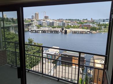 This is about a 390 sq ft studio apartment with about a 40 sq ft deck overlooking portage bay. It is laid out as 2 rooms with kitchen & bathroom (separated of course) in between the rooms. This is unit 404 on the top floor. We've got an elevator and 2 washers & 2 dryers in the basement (which means is 24hr accessible, also card operated $1.50 each). Our parking is currently all rented out but you'd be first on the waitlist if needed. Parking is at market rate.