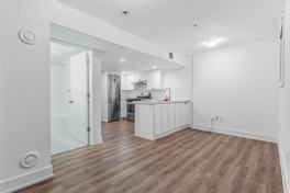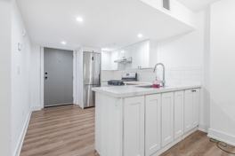 This stylish one-bedroom unit offers all the comforts of home, featuring stainless steel appliances, including a dishwasher, along with the convenience of in-suite laundry. The modern white kitchen is both functional and elegant, complete with ample cupboard space, stone countertops, a peninsula-style island, and a beautiful accent backsplash that enhances the overall design.