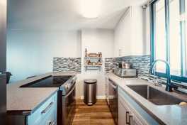 Beautifully furnished condo with sweeping views of the Koolau Mountains and Ala Wai Canal. Fantastic ocean views from the kitchen window! Bright open-concept living area that's fully furnished with modern luxury furniture and featuring a wall of windows leading to a covered lanai—perfect for relaxing and enjoying the views. The kitchen offers solid countertops, ample cabinetry, stainless steel appliances and incredible ocean views.