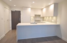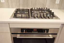 - High-end stainless steel appliances, 5-burner gas cooktop, polished quartz stone waterfal-style countertops, in-suite washer and dryer, laminate flooring throughout the living room and bedrooms;