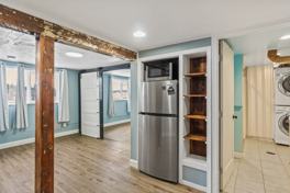 Nice sized bedroom comfortable fits queen size bed + dresser; Thoughtful safe maximizing touches with built in coat rack, built in shelving to maximize kitchen storage and sliding door to bedroom.