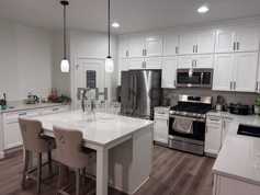 Step into a bright and inviting kitchen featuring sleek stainless steel appliances, elegant white countertops, and ample cabinet space—perfect for keeping everything organized. The kitchen island provides a great spot for casual seating, while the adjacent dining area easily accommodates a dining table, making it ideal for both everyday meals and entertaining.