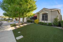 Both the front and backyards feature low-maintenance artificial grass, providing a clean, green look year-round without the hassle of upkeep.