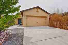 This beautiful home is conveniently located near 98th Street and Dennis Chavez. The spacious living room features a ceiling fan and opens to a breakfast bar overlooking the eat-in kitchen, which offers stainless steel appliances, ample cabinet space, and a pantry. The primary bedroom includes an en-suite bathroom with a single vanity, a large shower, and a wardrobe closet. Two additional guest bedrooms, a full guest bathroom, and a laundry room with washer and dryer complete the interior. The backyard features low-maintenance landscaping for easy outdoor living.
