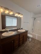 The 3 bedrooms are located Upstairs with 2 full bathrooms. Master Bedroom has a Huge Walk In Closet and double sinks in the bathroom.