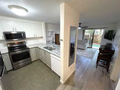 The unit features a remodeled kitchen with granite countertops, tiled backsplash, double stainless-steel sink with a premium faucet, newer cabinetry, dishwasher and stainless-steel appliances including a stove, microwave, refrigerator.