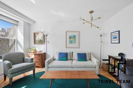 The open kitchen is equipped with Caesarstone countertops, ample cabinetry, and a Viking refrigerator, flowing seamlessly into a sun-filled south-facing living room with peaceful garden views. Step out onto your private balcony—perfect for morning coffee or unwinding at sunset.