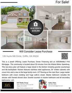 This is a jewel! Lease purchase available......The community is located about 20 minutes from the Atlanta Motor Speedway. This two-story plan will feature a large island in the kitchen including granite countertops and tile backsplash. Kitchen features stainless steel appliances, 36" shaker cabinets with crown trim, and a view to the large family room. LVT flooring on the main floor. Large master bedroom with crown molding and huge walk-in closet. Master bathroom includes tile shower with framed shower door. Granite counters in master bathroom and all secondary bathrooms. Loft.