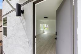The interior features an open-concept living space with wide-plank hard flooring throughout. The updated kitchen is appointed with white quartz countertops, shaker-style cabinetry with matte-black hardware, a deep undermount sink with a contemporary pull-down faucet, and all stainless steel appliances, including gas range, dishwasher, over-the-range microwave, and refrigerator. Flush mount LED lighting provides clean, even illumination. The bathroom is finished with modern tilework and upgraded fixtures. Large windows bring in abundant natural light.