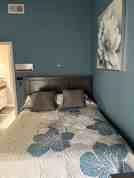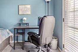This spacious King Suite with Patio is thoughtfully designed to provide exceptional comfort, making your extended stay away from home feel welcoming and relaxing. The bedroom suite features a plush King Bed, a desk, an ergonomic chair with heat and massage functions, a microwave, Keurig coffee maker, and a compact refrigerator. Enjoy the convenience of an en-suite bathroom featuring double sinks, a spacious soaking tub (perfect for unwinding after a long day), and a luxurious rain shower. Experience complete privacy in your own section of a peaceful residence, with exclusive access to premium amenities like the heated massage chair and the rejuvenating rain shower, ensuring a tranquil and memorable stay.