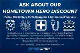 Second Avenue is proud to offer the Hometown Hero Leasing Discount Program to honor and support local heroes, including police officers, firefighters, emergency medical personnel, educators, and government employees. Eligible participants who are fully approved for a lease will enjoy a reduced security deposit on their Second Avenue home. This offer cannot be combined with other promotions or discounts unless otherwise specified. Available in Select Markets - Ask About Eligibility.