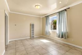 The downstairs layout includes two bedrooms, one full bathroom, and main living areas featuring easy-to-clean tile flooring, large windows, and recessed lighting. The kitchen offers plenty of solid oak cabinet space, durable granite countertops, a gas range, and a refrigerator. A dedicated interior hall alcove provides convenient washer and dryer hookups with ample space for your machines. The downstairs bathroom provides a wooden vanity with a dark stone top, a standard bathtub, and a separate walk-in shower stall.