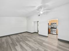 This home features a bright and inviting interior with vaulted ceilings, central A/C, and lighted ceiling fans throughout. The updated bathroom adds a modern touch, while the compact kitchen is equipped with stainless steel appliances and granite countertops. The oversized 12’ x 20’ bedroom offers generous closet space for added comfort.