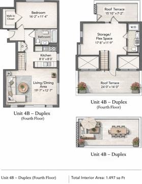 A striking interior staircase leads to the upper level loft , which functions as a versatile second bedroom or flexible living space with generous storage. This level also includes a half bathroom with in -unit washer and dryer and provides access to two private outdoor terraces , perfect for outdoor dining, entertaining, or enjoying the open sky views.