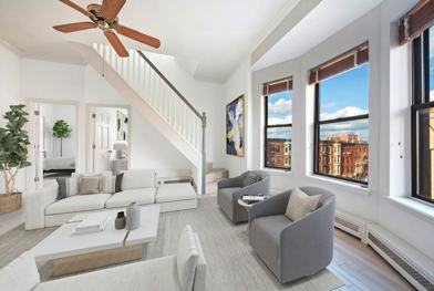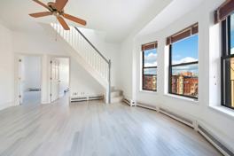 Penthouse living in Park Slope with stunning city views from each room. 3 flights up, enter past the large hallway closet and in-unit washer dryer into the spacious light-flooded living area with 10 Ft ceilings & bay windows. Adjacent is the open chef's kitchen with stainless steel appliances, storage and ideal for cuisine creativity or entertaining. Off the living room, the bright master bedroom has skyline views and a spacious walk-in closet. The similarly sized 2nd bedroom has a large closet and overhead storage perfect for guests. Travel upstairs to the light-filled home office mezzanine landing which leads to the huge private roof deck. Enjoy outdoor dining or sunset drinks whilst taking in the epic panoramic Manhattan skyline views. Situated amongst top Park Slope restaurants, cafes & stores with Prospect Park and the subway just 2 blocks away. This apartment is a must-see. Sorry no pets. 1st month rent: $4,995 Security deposit: $4,995 Credit check: $20