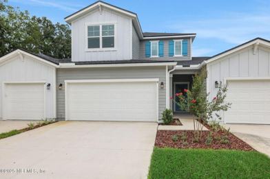 This two-story home features three bedrooms, two and a half bathrooms, a versatile bonus area, and a convenient first-floor owner's suite. A two-car garage provides ample storage. Interior highlights include wood-look tile in the main living areas, quartz countertops, a gourmet kitchen with stylish kitchen backsplash, floor-to-ceiling tile in the master bath, and a steel tub with tile surround in the secondary bath. The Sago floor plan offers 1,853 square feet of stylish and functional living space. Additional features include a tray ceiling in the loft and iron spindles on the staircase. Located in The Hammock a gated community, this neighborhood offers a clubhouse with a pool, hot tub, and party kitchen.