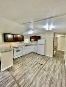 Beautifully updated open concept 3/2 manufactured home with slight peaked ceiling. New Wood Grained vinyl flooring throughout. New kitchen with laminate counter, new kitchen base cabinets. Freshly painted a light color. BBQ/Grill in your own nice fenced yard with nice shade tree also with shed.