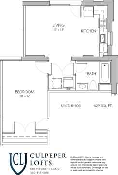 The Culpeper Power and Water Works are comprised of 2 separate structures, the power plant having been dedicated in July 1934 and the Water Works in 1946. The buildings have been renovated into 22 market-rate rental housing – studio and one-bedroom “loft-style” residences – known as Culpeper Lofts. The parking and grounds have also been revamped. The historic features were preserved and highlighted as this project utilized federal and state historic rehabilitation tax credits, so the redevelopment design is overseen by both the Virginia Department of Historic Resources and the federal National Park Service. Unit B108 is a small one-bedroom unit with its own private exterior entrance.
