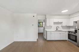 This unit has been completely updated: new cabinets, new flooring, and a fully remodeled bathroom. At approximately 400 square feet, it’s a well-designed space that makes efficient use of every square foot.