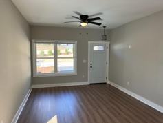 * Living room with ceiling fans and balcony access