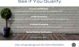 The monthly rent listed is based on a 12 month lease. Properties are leased on a first-come, first-served basis decided by lease signing, deposit payment, and move-in dates. Property photos and descriptions are representative. Lessee responsible for viewing premises to verify before lease signing. Complete a rental application online at www RenuPropMgt com