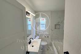 The bathroom includes a vanity with cabinet storage, mirror, and a tiled shower surround, giving it a clean and updated feel.