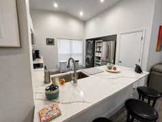 Enjoy stylish driftwood-inspired plank flooring throughout the living room, kitchen, and bedrooms, complemented by tile in the entryway, dining room, and family room. Volume ceilings enhance the open, airy feel of the home.
