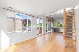 Perched on the top floor, this expansive 1,000-square-foot residence offers an airy, loft-like feel with soaring ceilings and abundant natural light throughout. The thoughtfully designed space features a dramatic open layout, highlighted by a large loft area, with skylights, that adds flexibility for a home office, creative studio, workout room, or additional living space. Large windows frame beautiful hilltop views, while a private balcony provides the perfect spot to unwind and take it all in. The modern kitchen is both stylish and functional, complemented by updated finishes, sleek lighting fixtures, and beautiful wood flooring that runs throughout the home. With access to the front yard and a bright, elevated setting, this unit offers a unique blend of indoor-outdoor living and contemporary comfort.