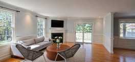 High ceilings, hardwood floors, a fireplace, and detailed moldings create a clean and cohesive interior. The family room opens to a private, fenced patio, offering a quiet outdoor extension of the living space.